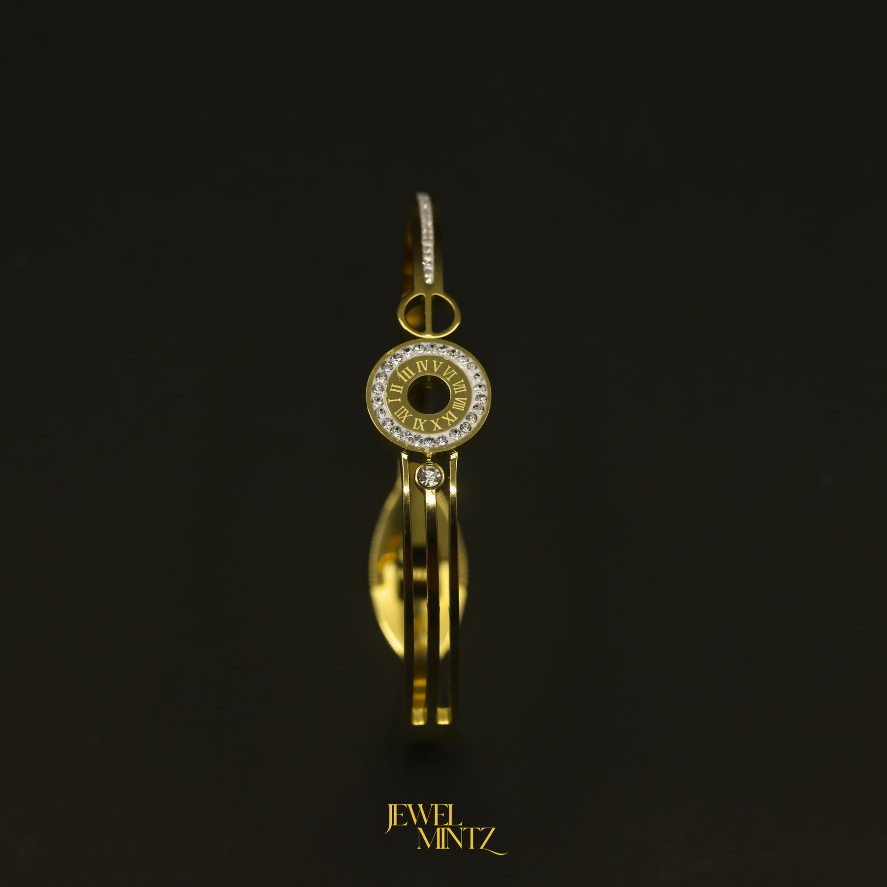 Elegant anti-tarnish gold watch bangle for women by Jewel Mintz. Features Roman dial, CZ stones, and long-lasting shine – perfect for timeless style.